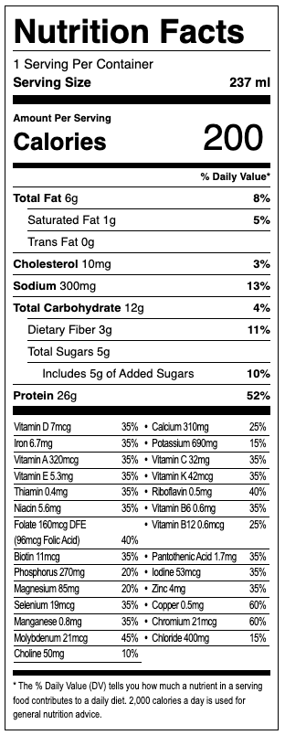 WATER, MILK PROTEIN CONCENTRATE, SOY PROTEIN ISOLATE, CANOLA OIL, AND LESS THAN 2% OF SUGAR, COCOA PROCESSED WITH ALKALI, CALCIUM CASEINATE, SODIUM CASEINATE, GUM ACACIA, FRUCTOOLIGOSACCHARIDES, POTASSIUM CITRATE, GLUCOSE SYRUP SOLIDS, CELLULOSE GEL AND GUM, INULIN (FROM CHICORY), MAGNESIUM CHLORIDE, SOY LECITHIN, SALT, SODIUM CITRATE, MALTODEXTRIN, ASCORBIC ACID, NATURAL AND ARTIFICIAL FLAVOR, CHOLINE CHLORIDE, CARRAGEENAN, SUCRALOSE, CALCIUM CHLORIDE, FERROUS SULFATE, DL-ALPHA TOCOPHERYL ACETATE, NIACINAMIDE, ZINC SULFATE, CALCIUM PANTOTHENATE, MANGANESE SULFATE, COPPER GLUCONATE, PYRIDOXINE HYDROCHLORIDE, VITAMIN A PALMITATE, THIAMINE HYDROCHLORIDE, RIBOFLAVIN, FOLIC ACID, POTASSIUM IODIDE, VITAMIN K1, CHROMIUM CHLORIDE, SODIUM SELENATE, BIOTIN, VITAMIN D3, VITAMIN B12